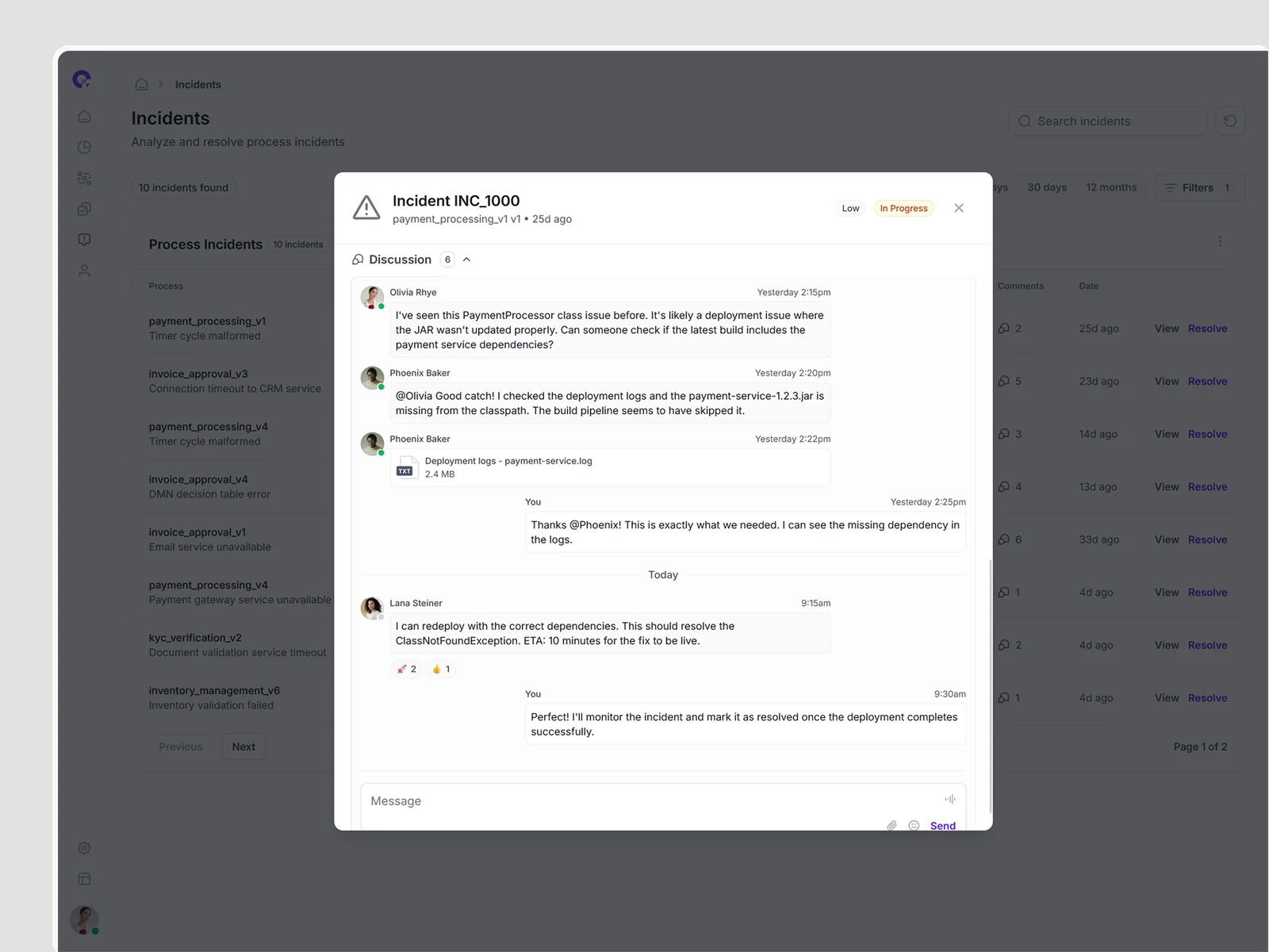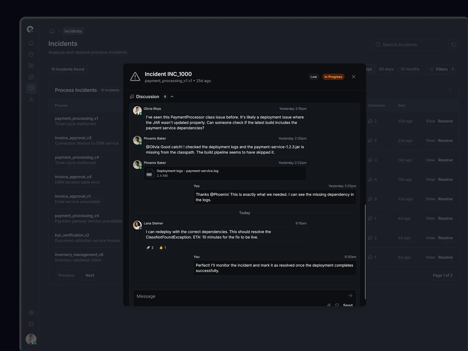 CAMUNDA incident management with AI-powered analysis and collaborative resolution tools.