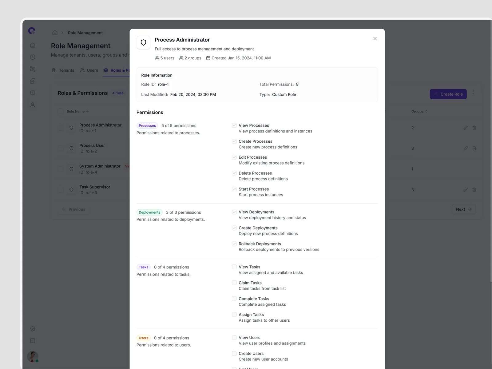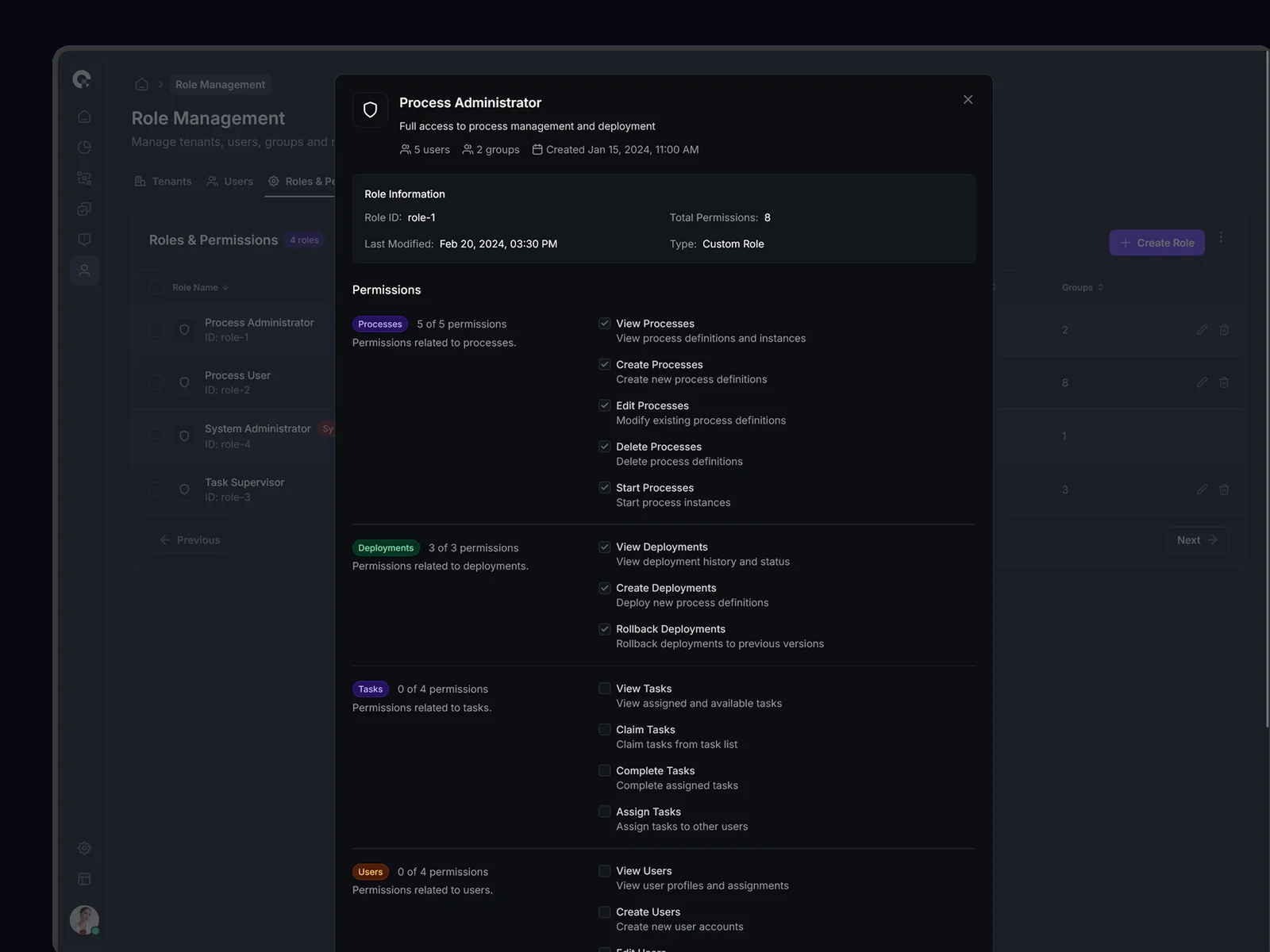 CAMUNDA identity and access management with multi-tenant architecture and role-based permissions.