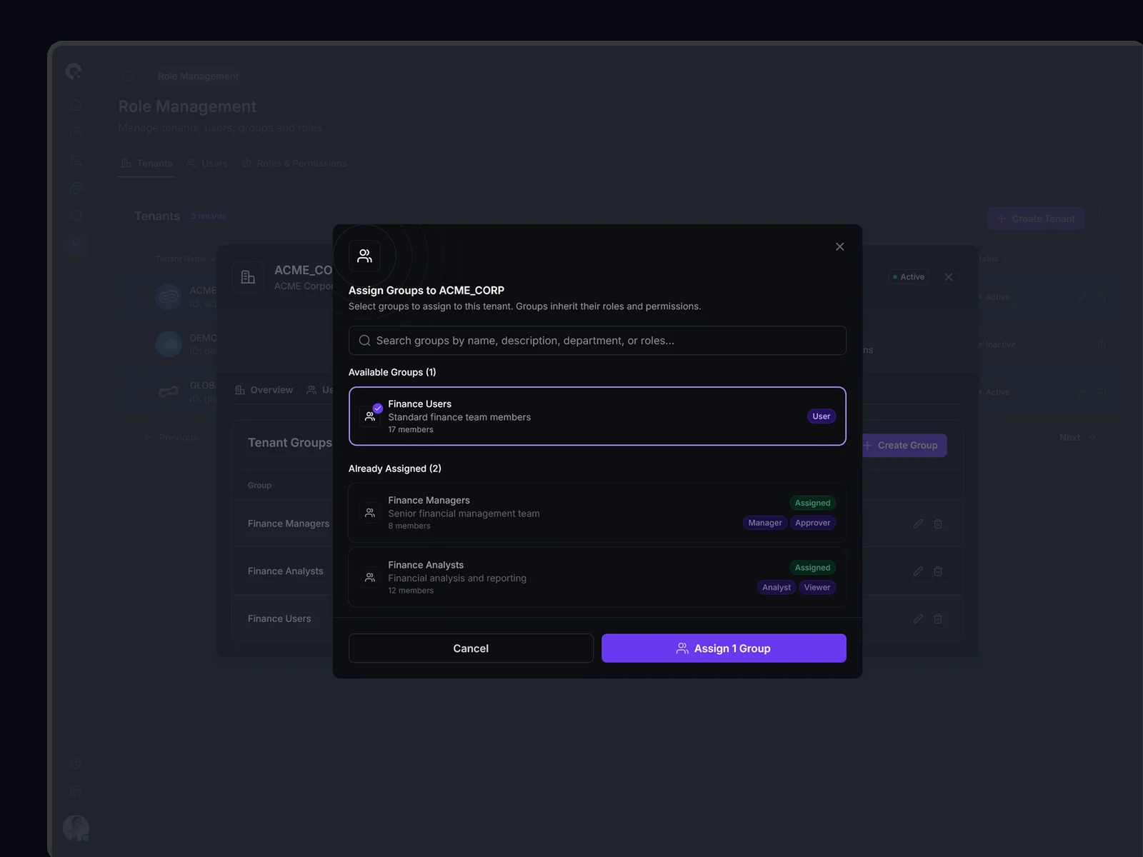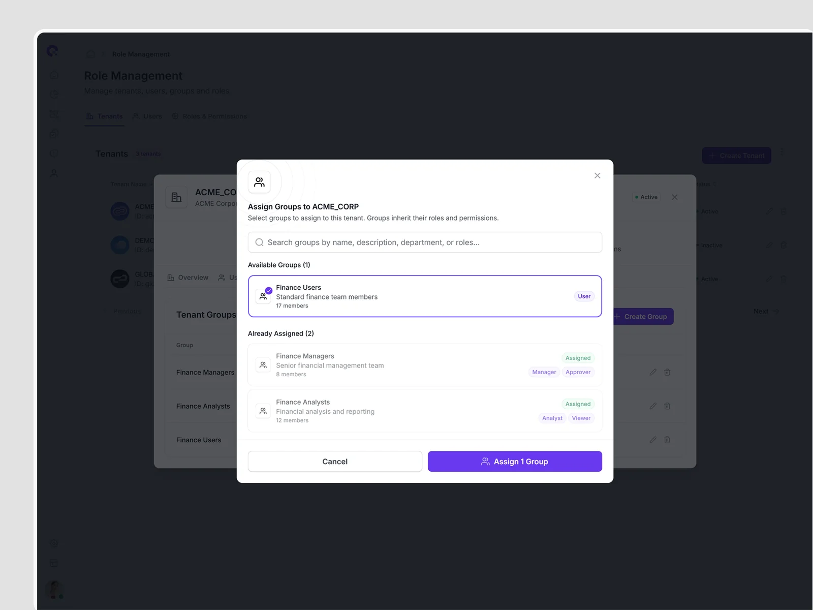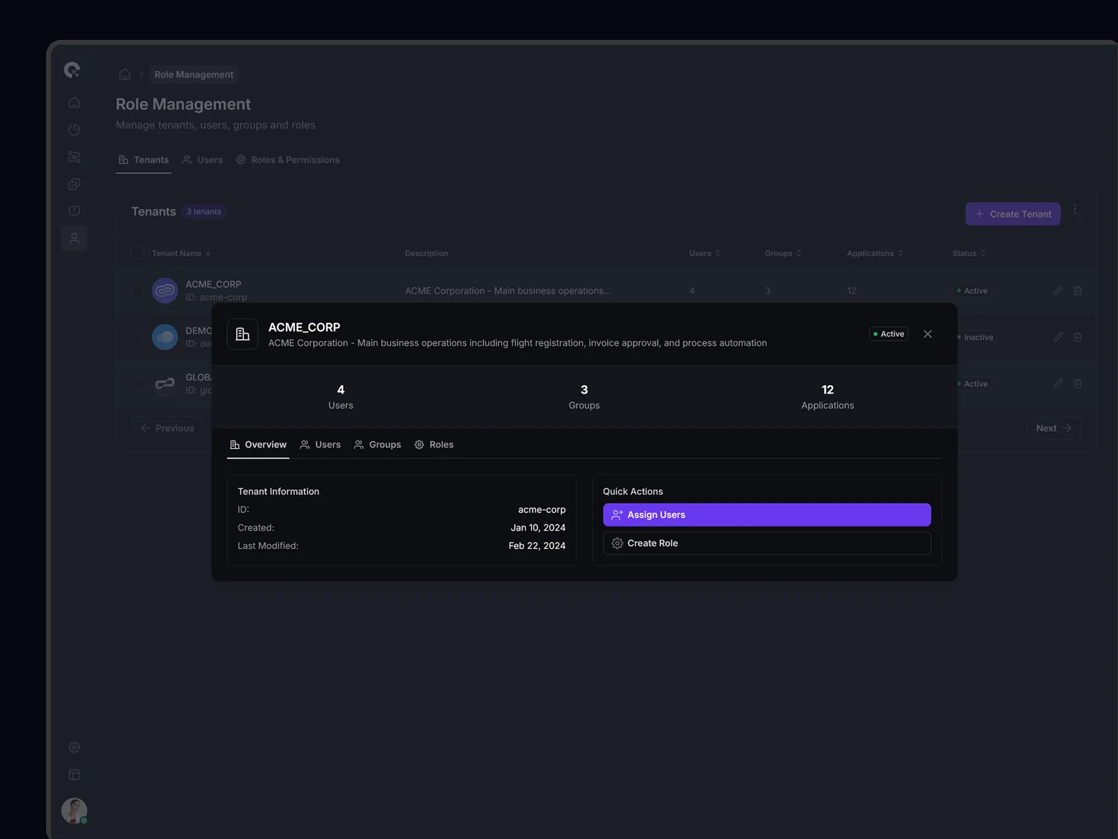 Tenant assignment workflow with access level configuration and approval process. Ensures proper governance in multi-tenant environments.
