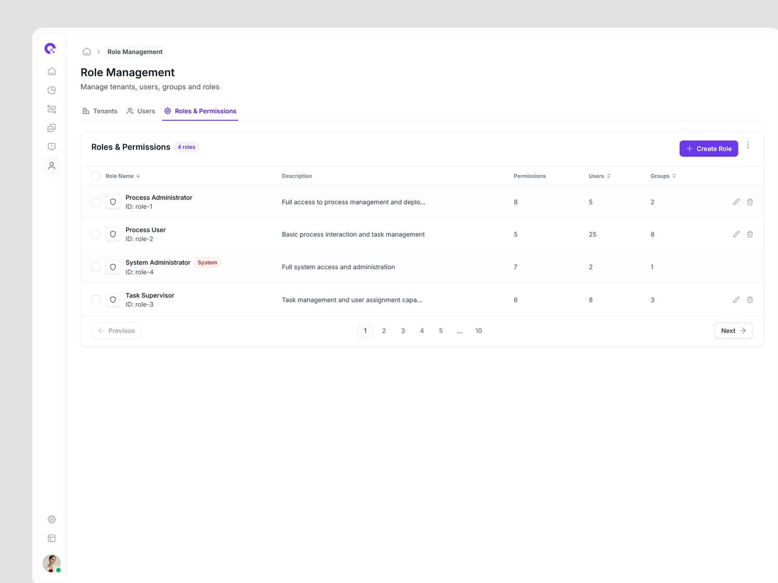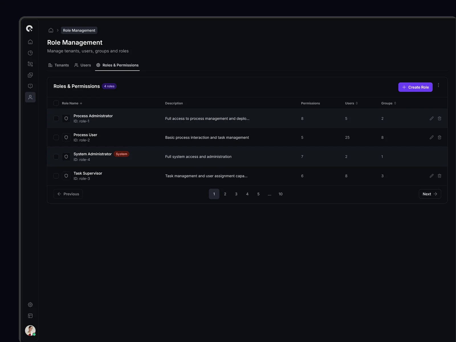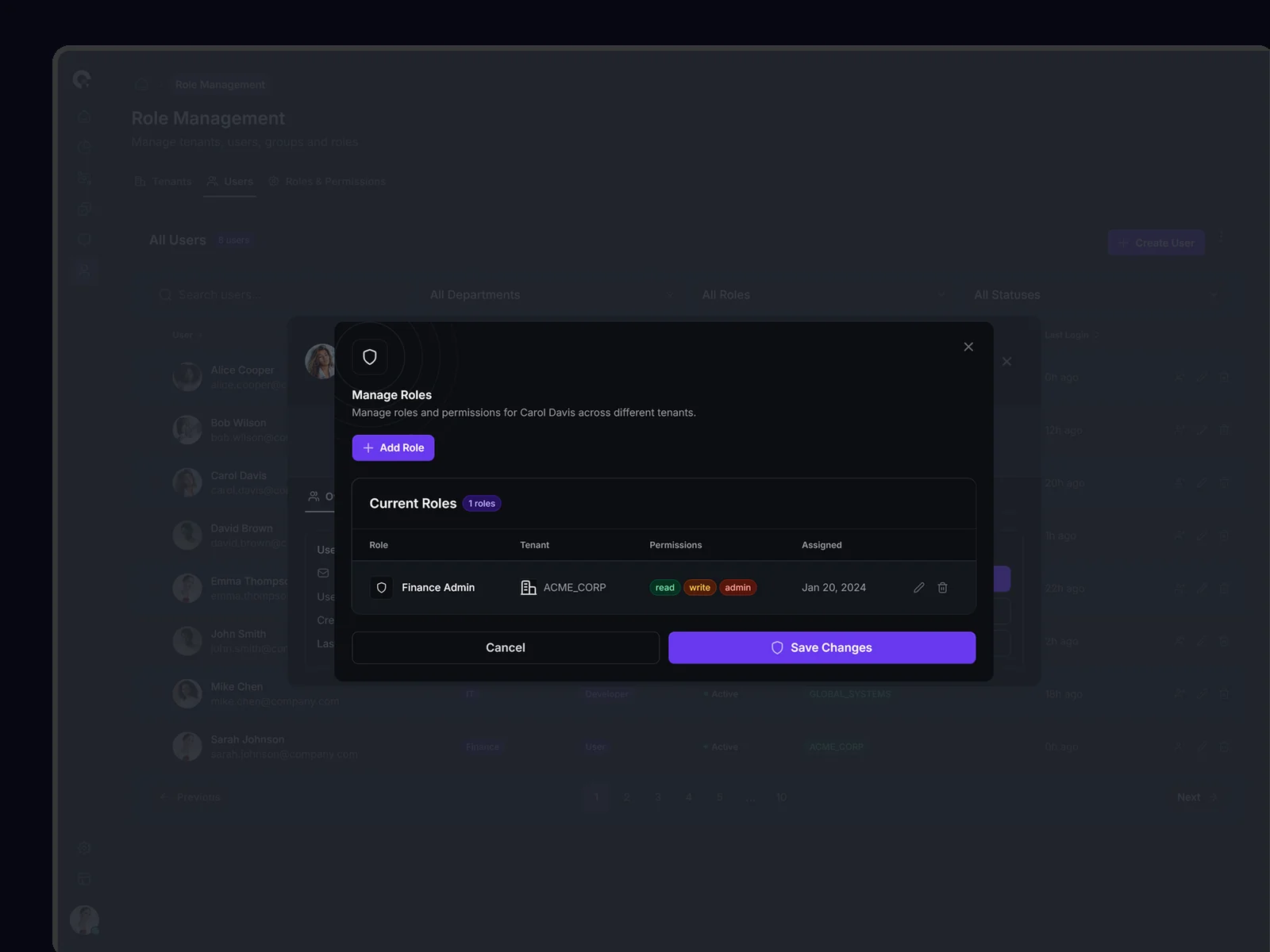 Advanced role management interface with drag-and-drop functionality, bulk operations, and permission inheritance visualization.