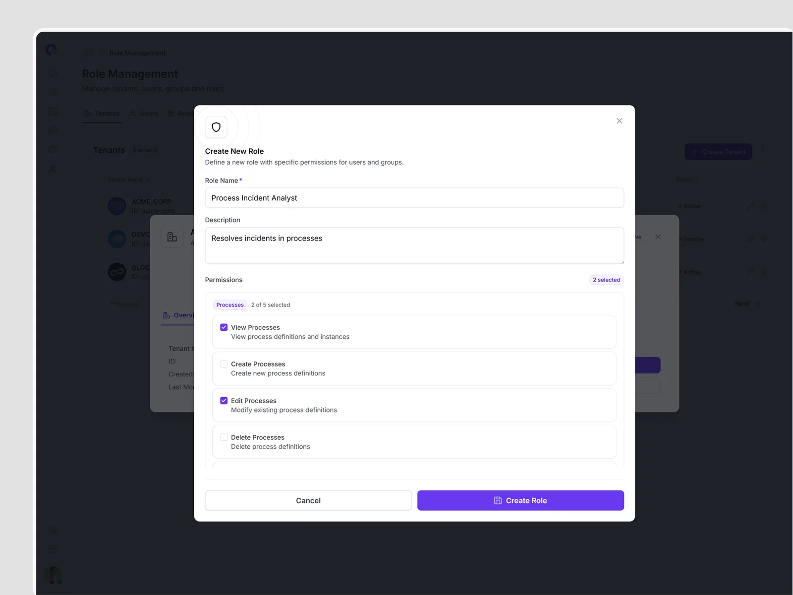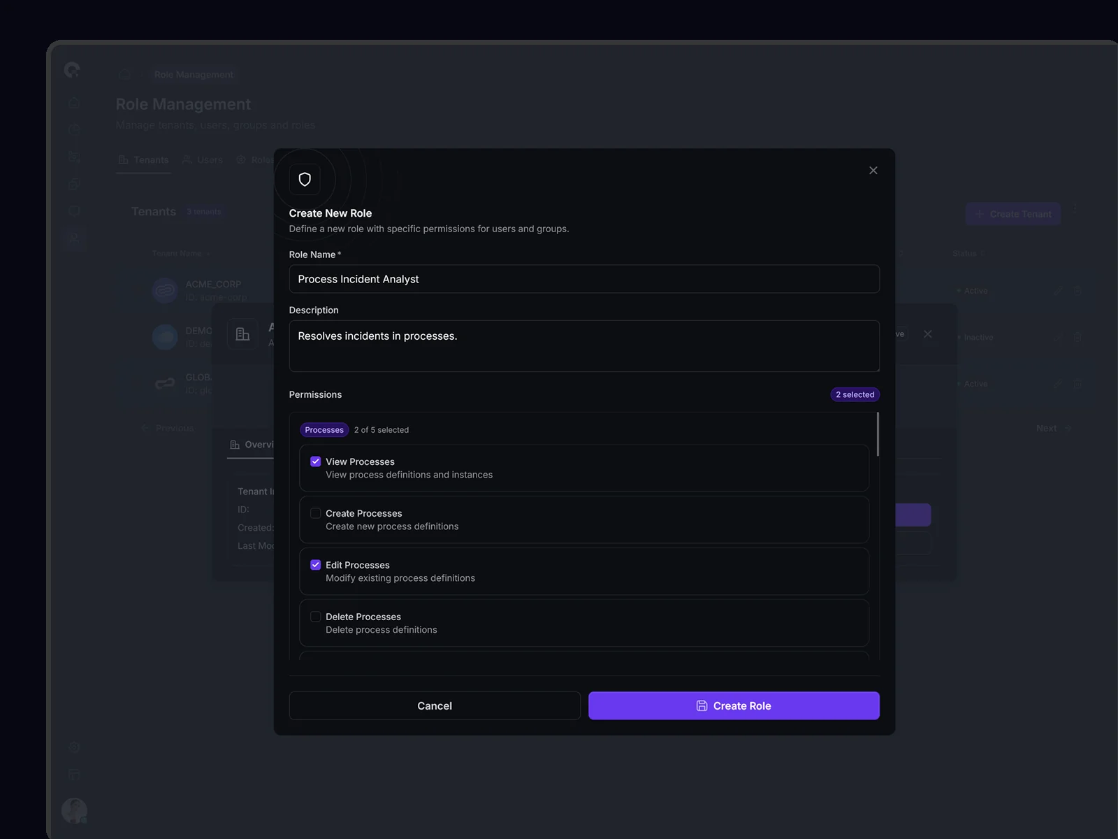 CAMUNDA tenant-specific user management with role assignments and access levels.