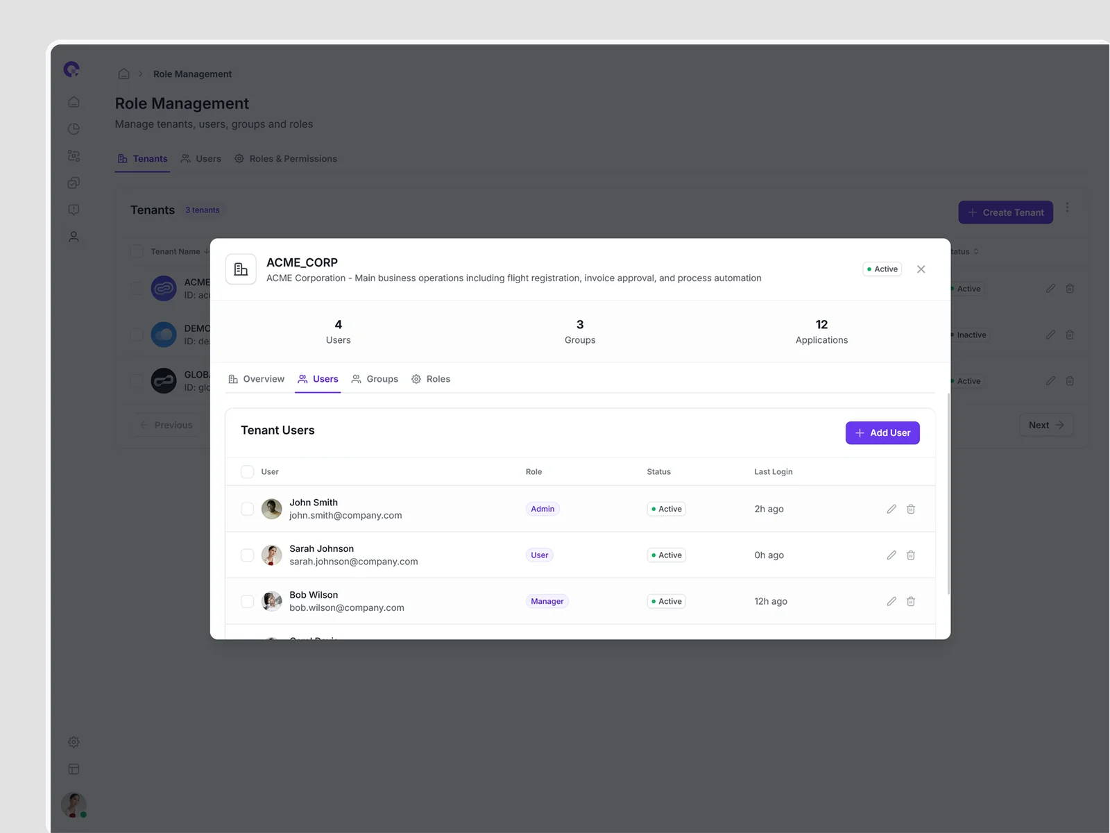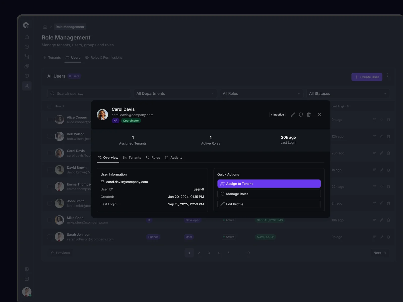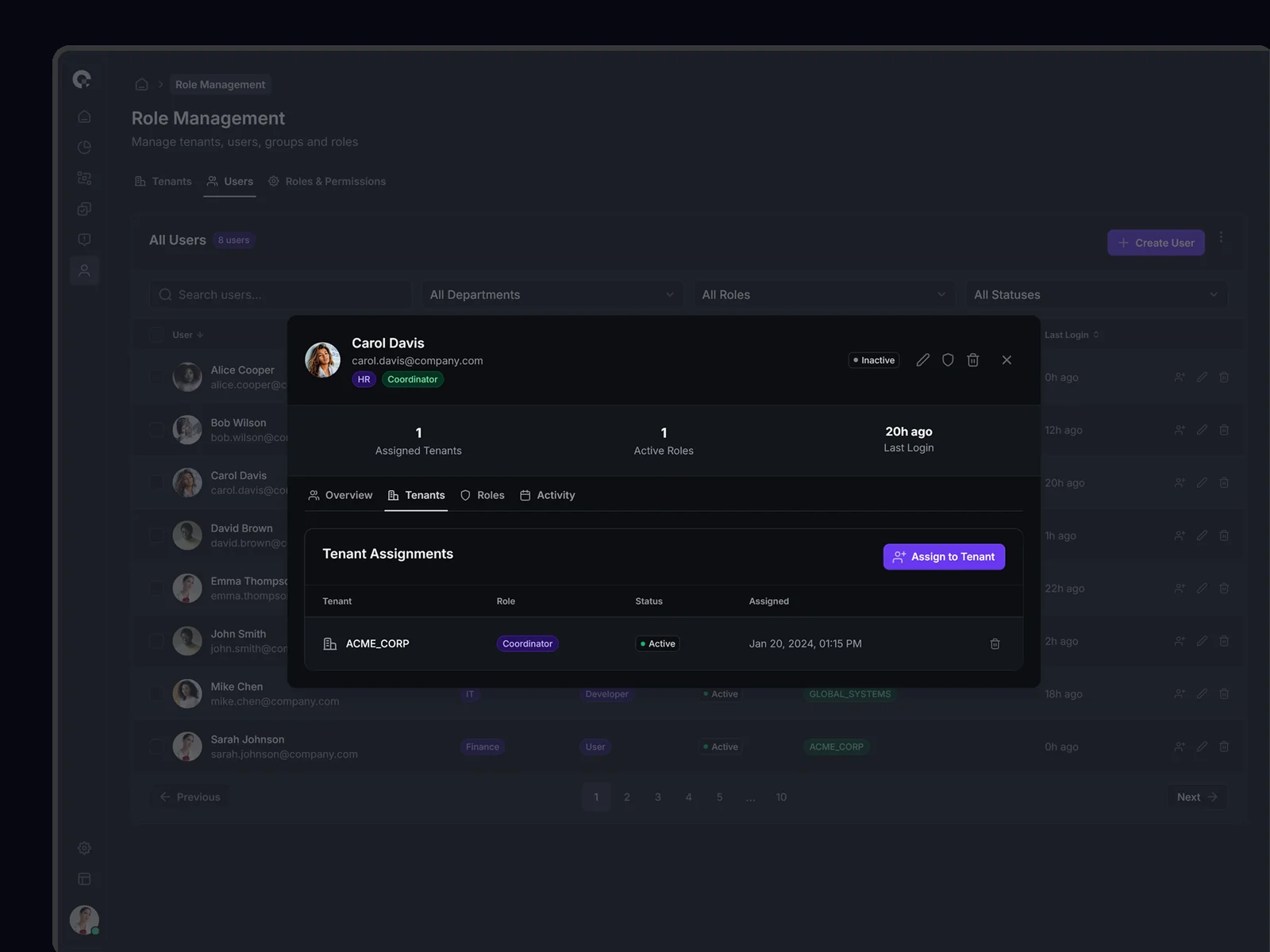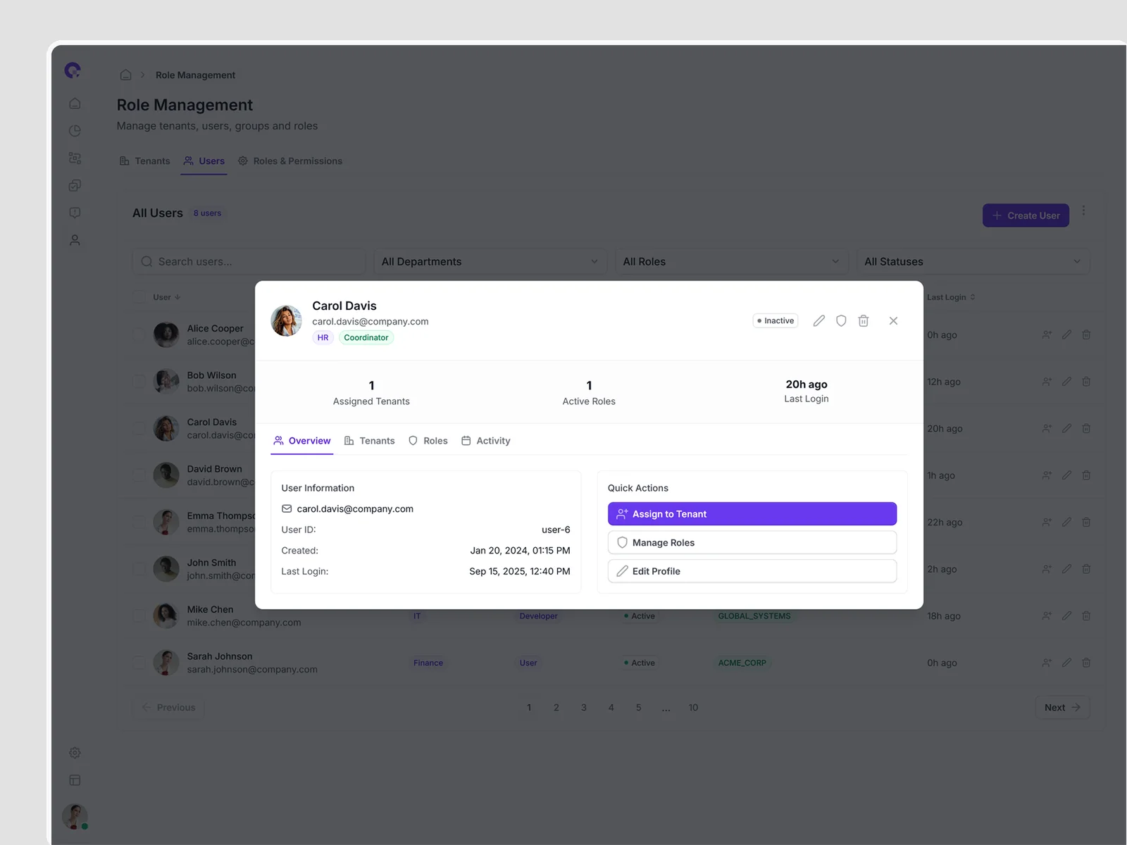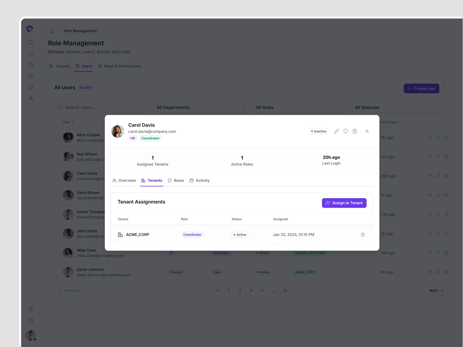 Multi-tenant user management showing all tenant associations, access levels, and tenant-specific permissions. Supports complex organizational structures.