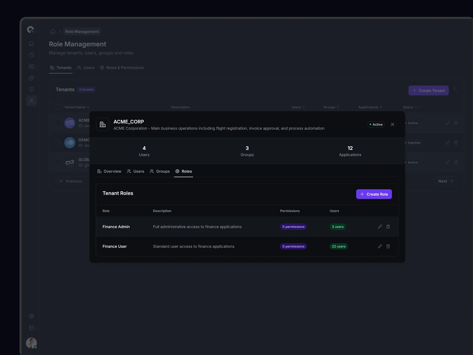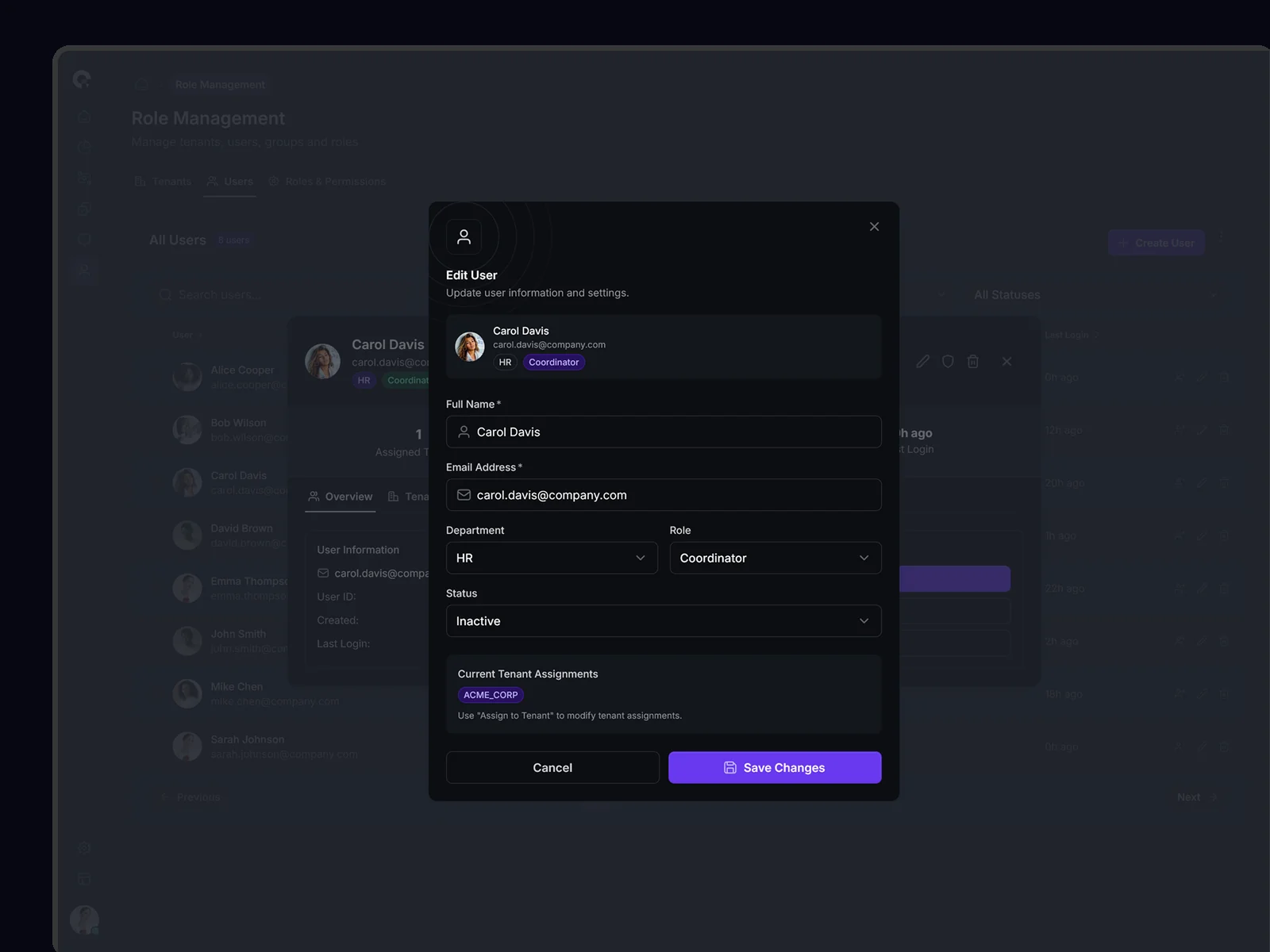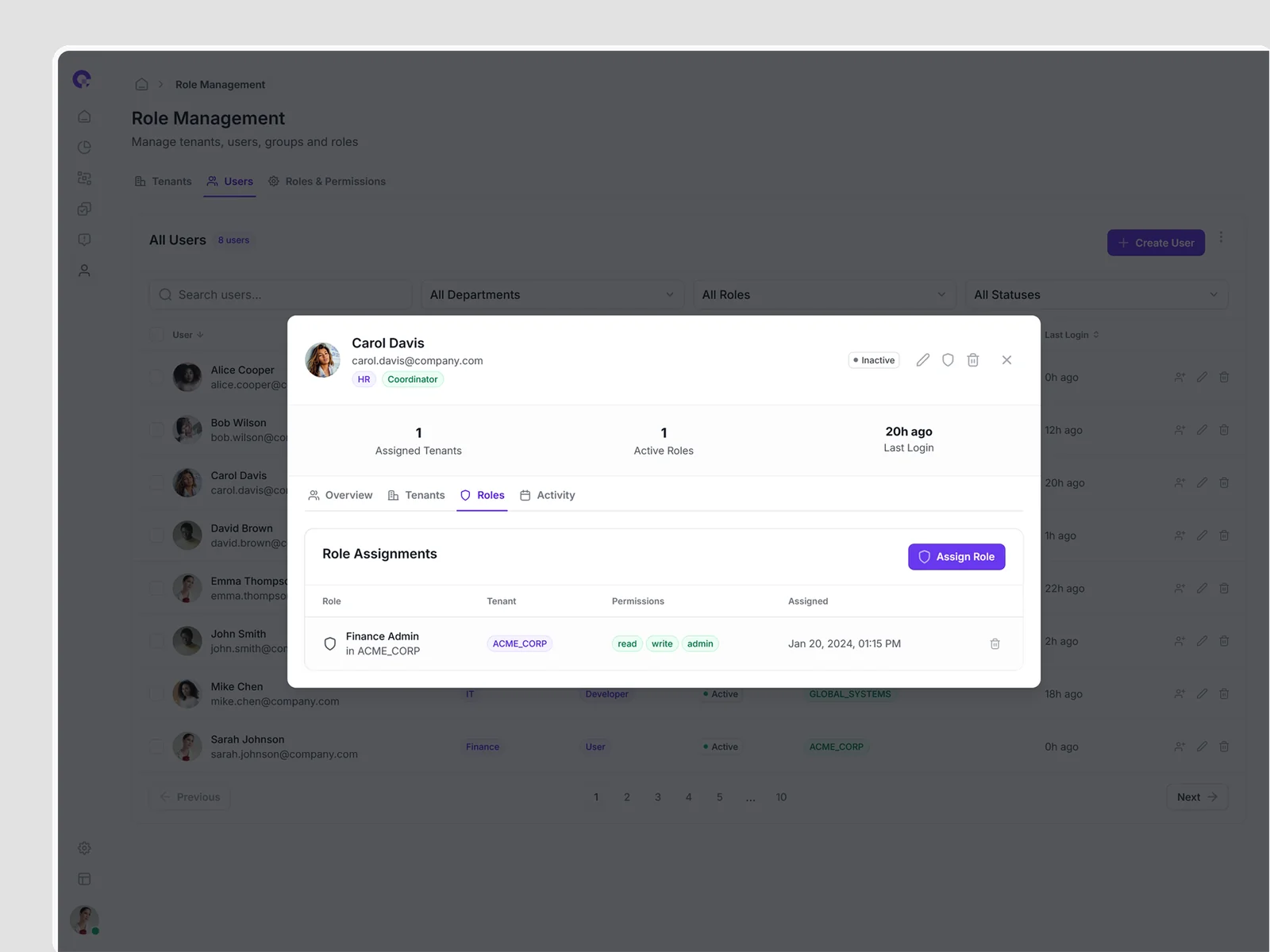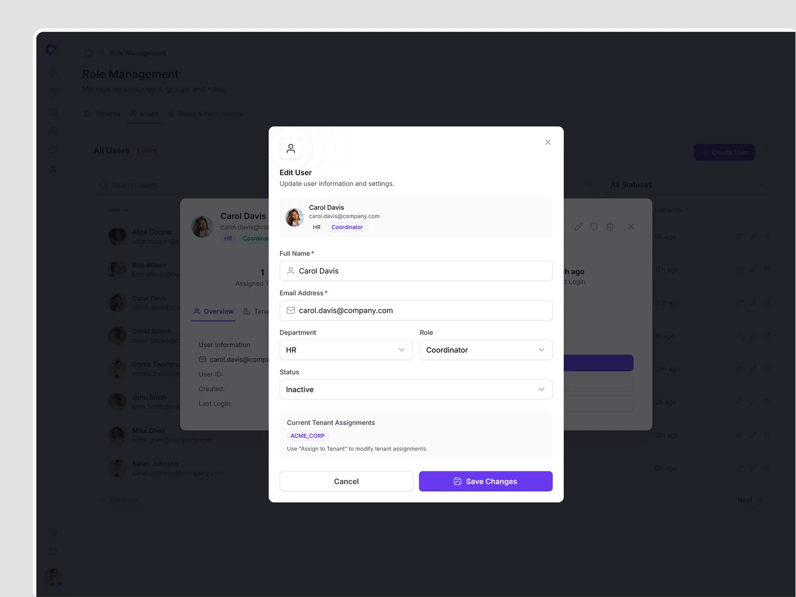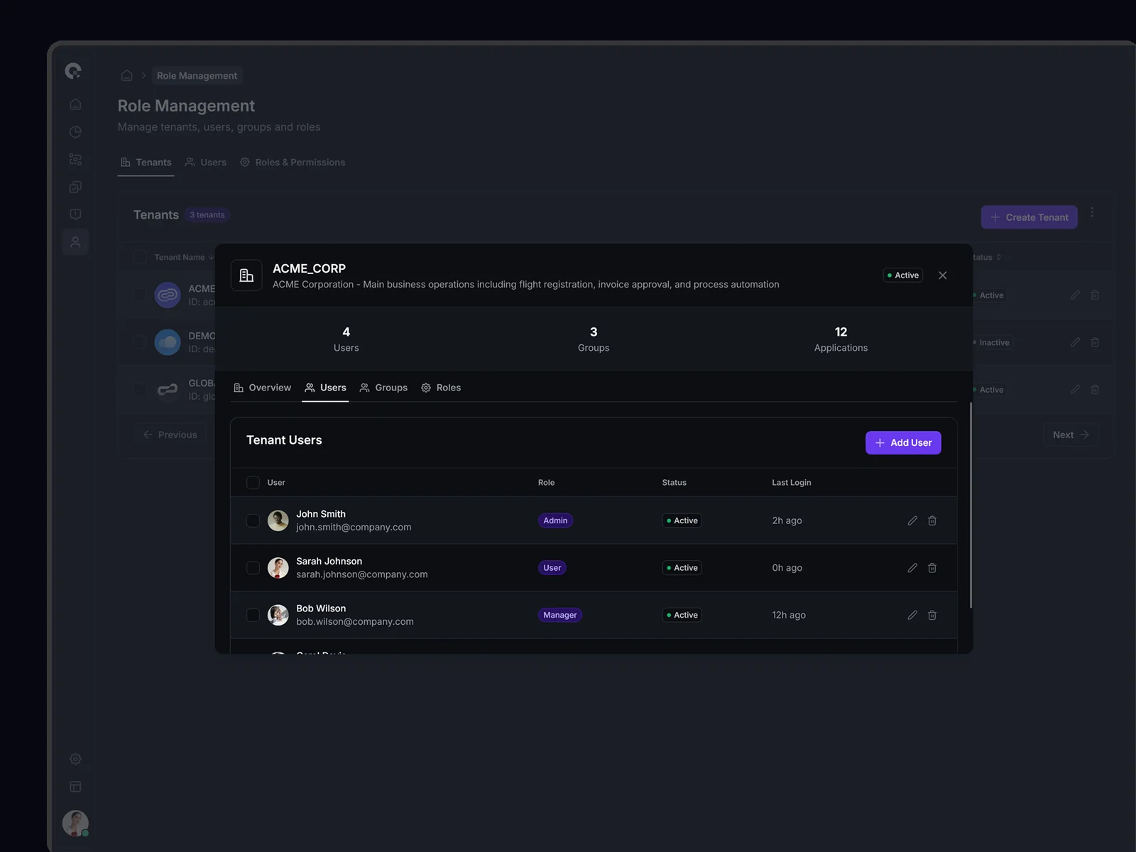 Multi-tenant user management showing all tenant associations, access levels, and tenant-specific permissions. Supports complex organizational structures.