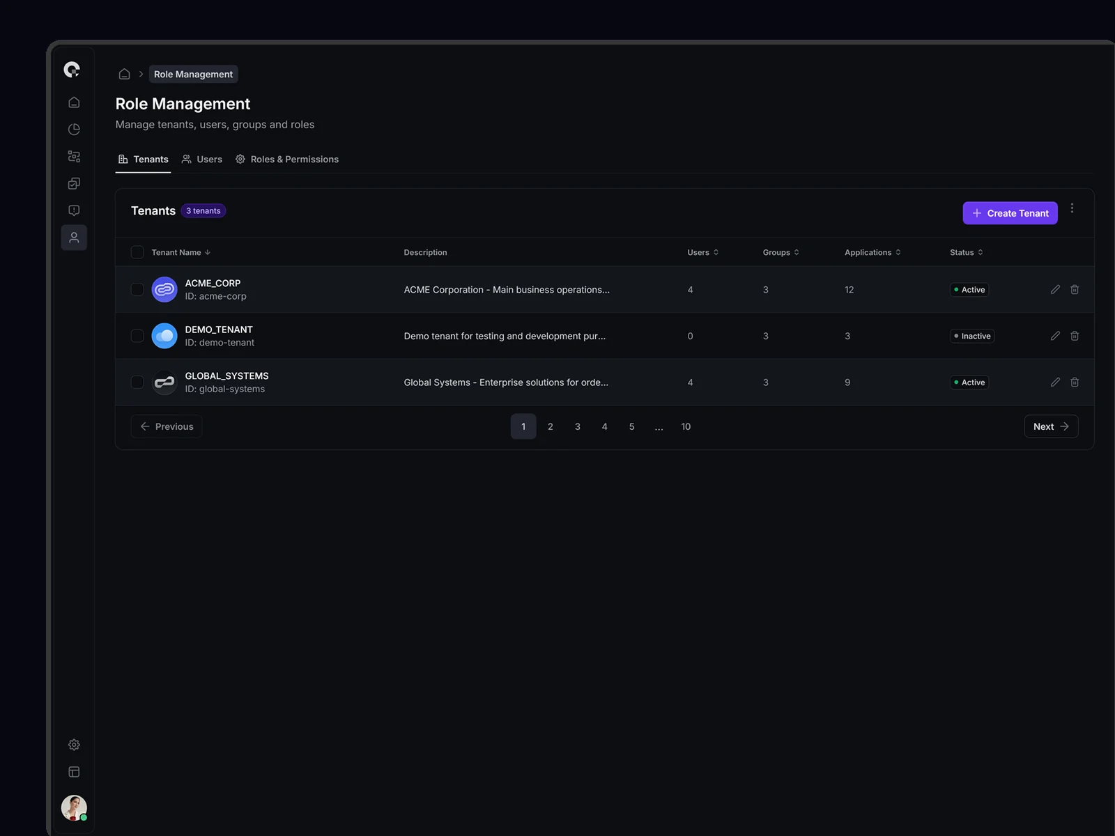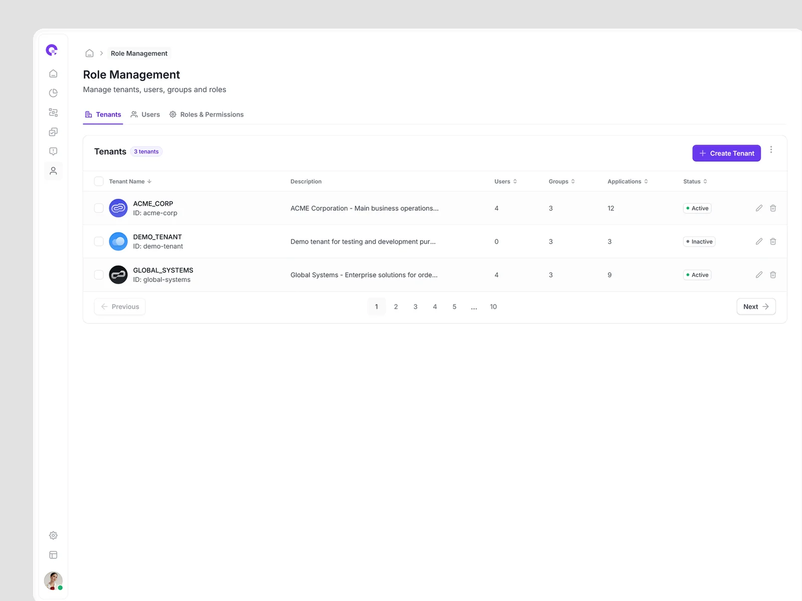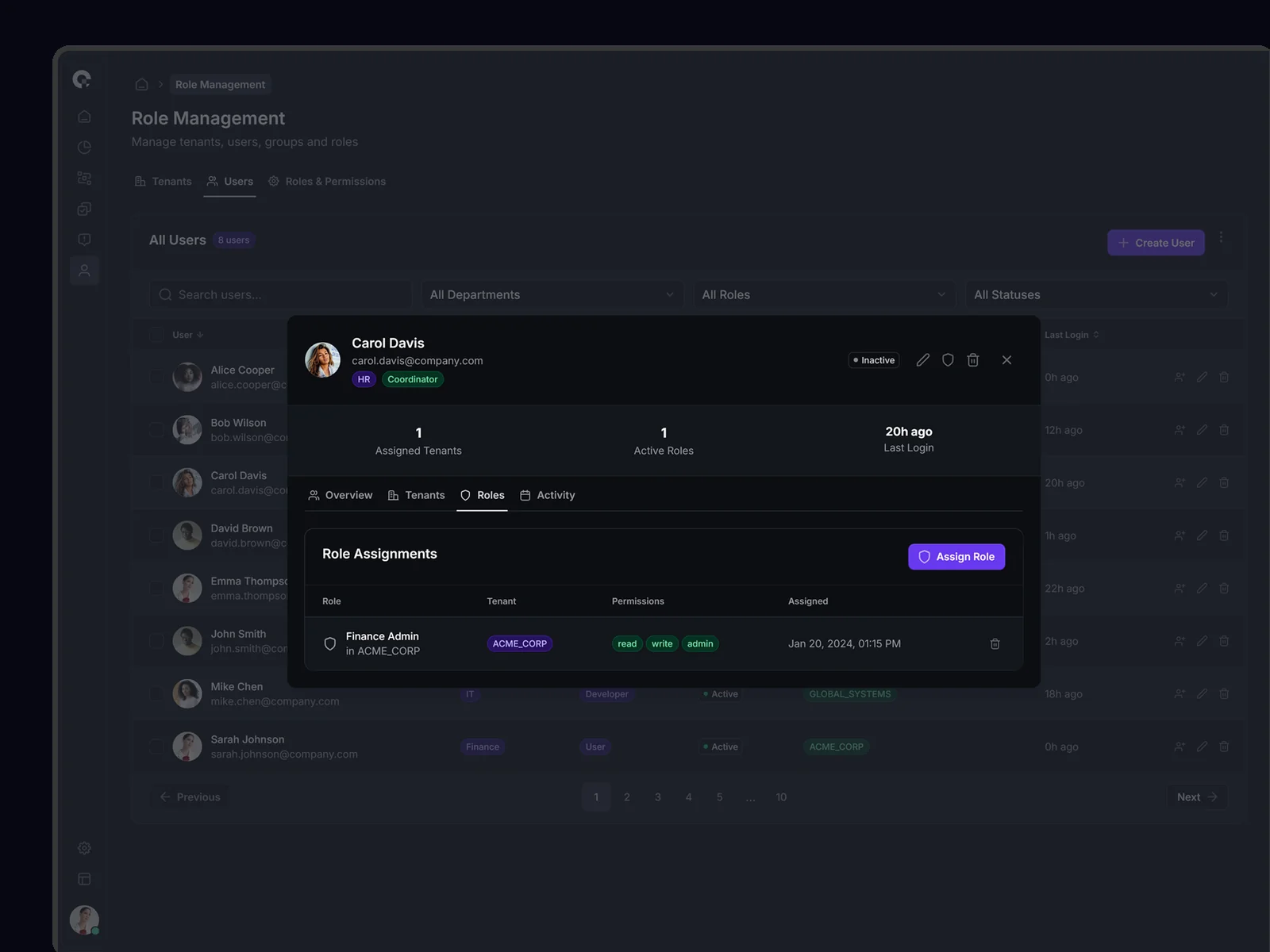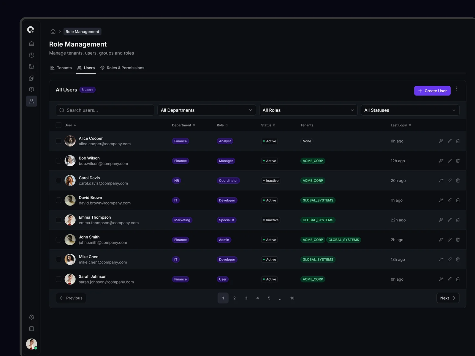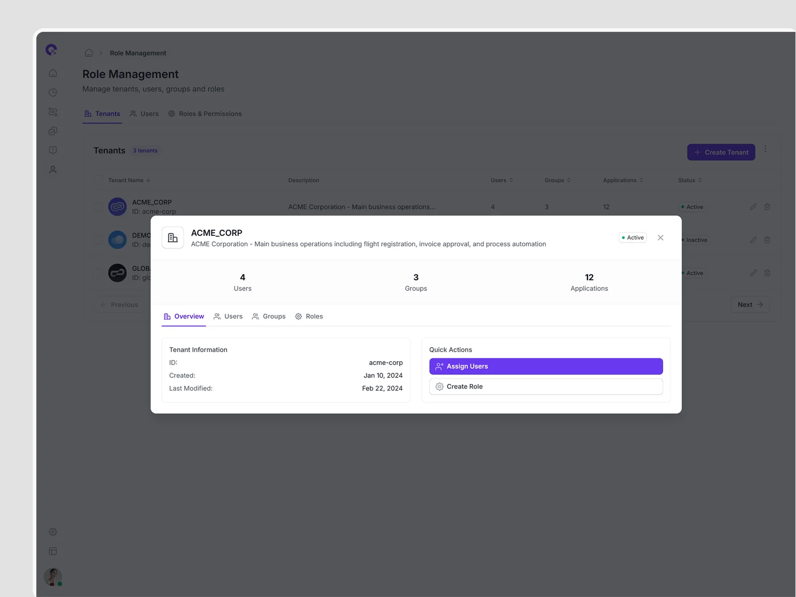 Multi-tenant user management showing all tenant associations, access levels, and tenant-specific permissions. Supports complex organizational structures.