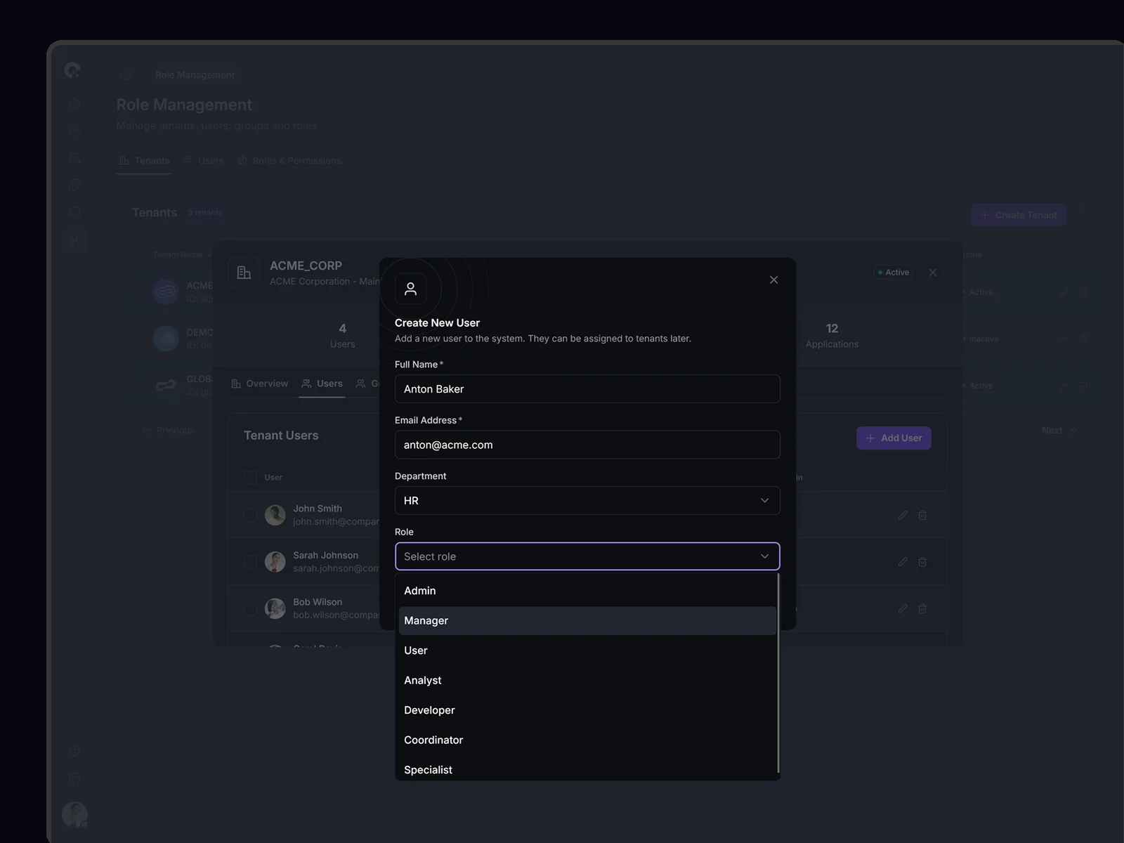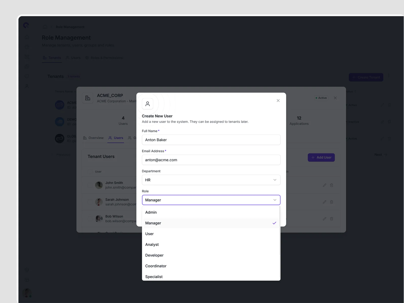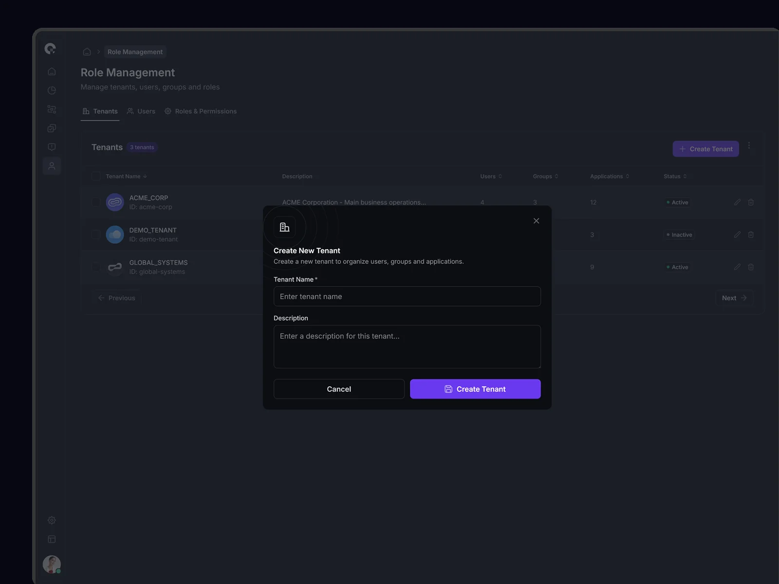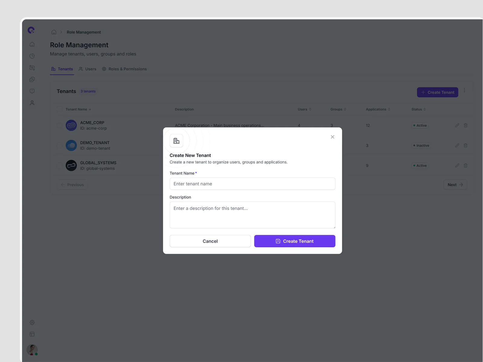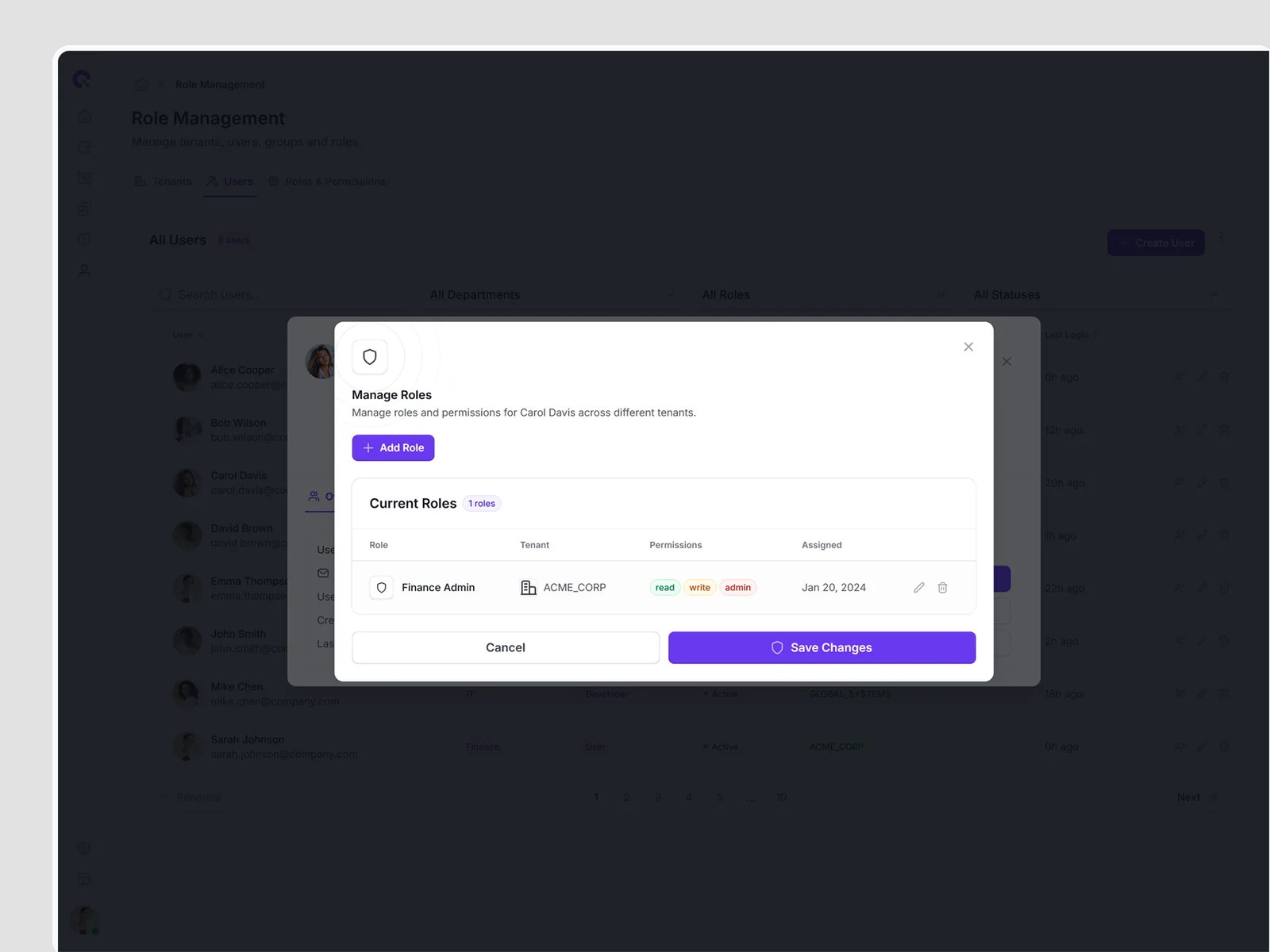 Multi-tenant user management showing all tenant associations, access levels, and tenant-specific permissions. Supports complex organizational structures.