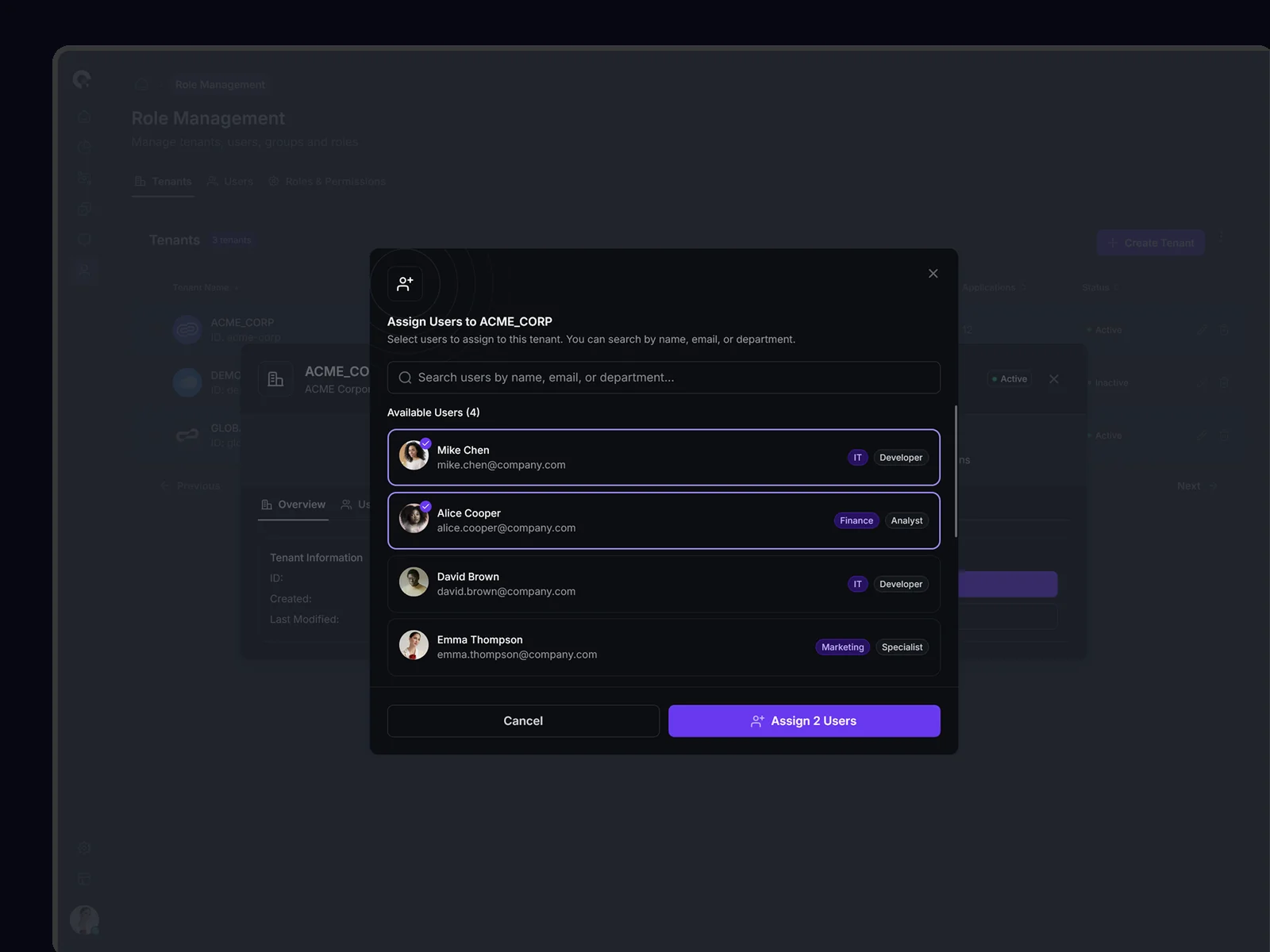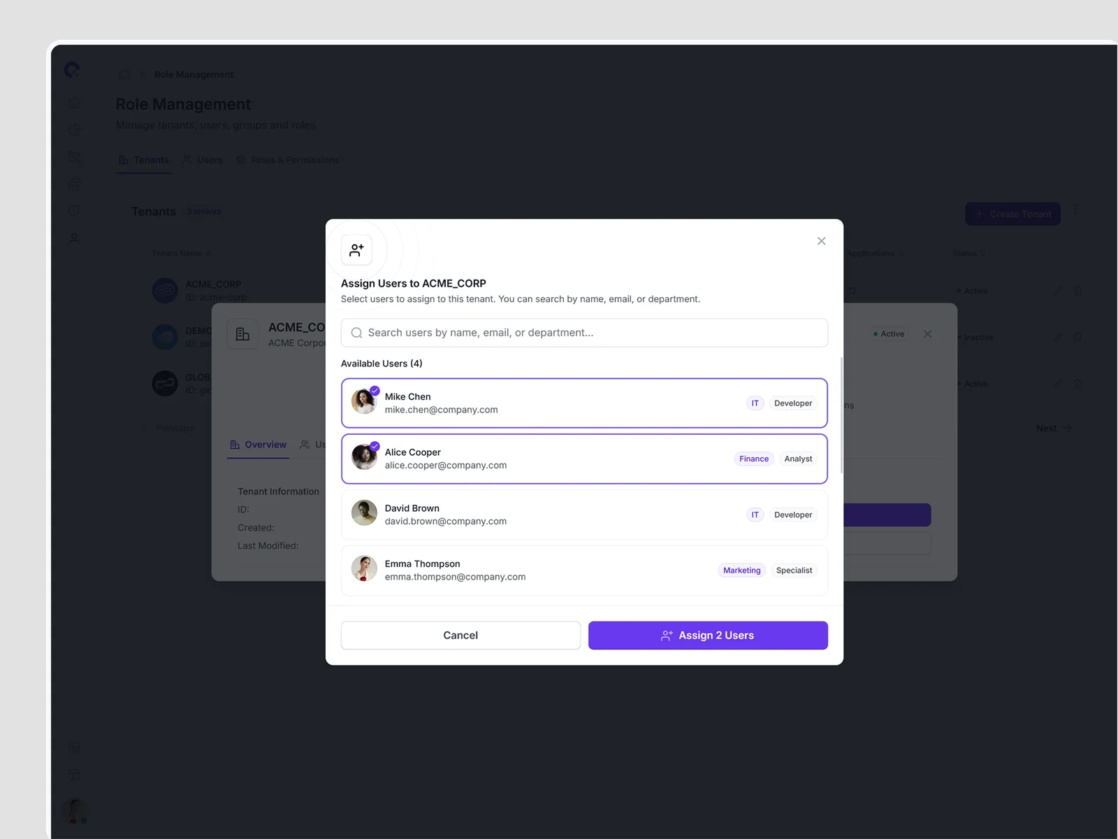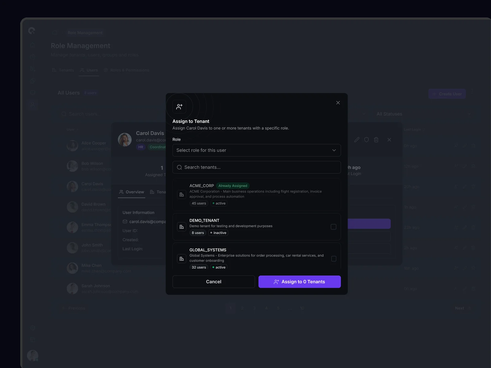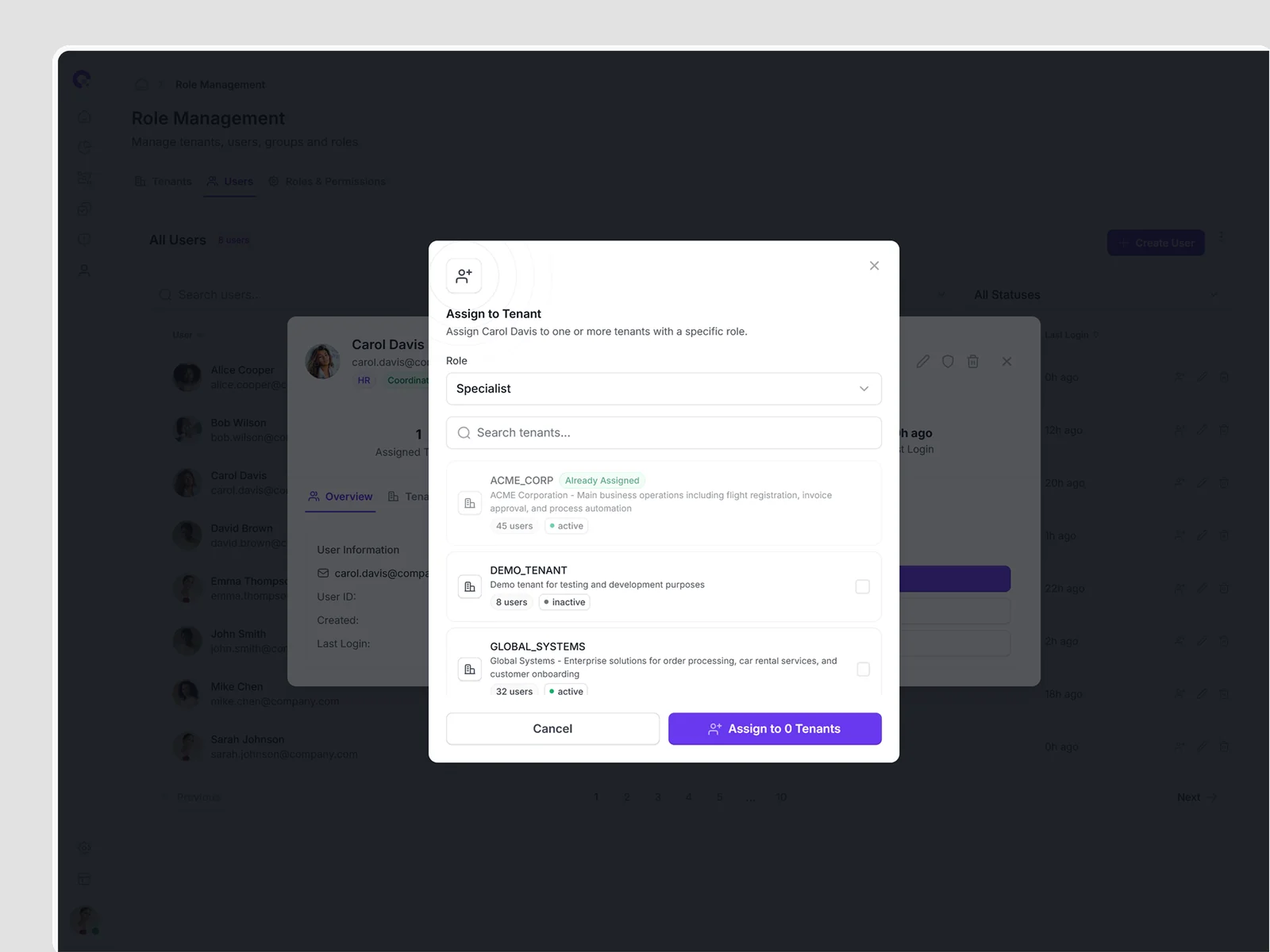 Efficient bulk assignment interface for associating multiple users with tenants. Streamlines organizational setup and restructuring processes.