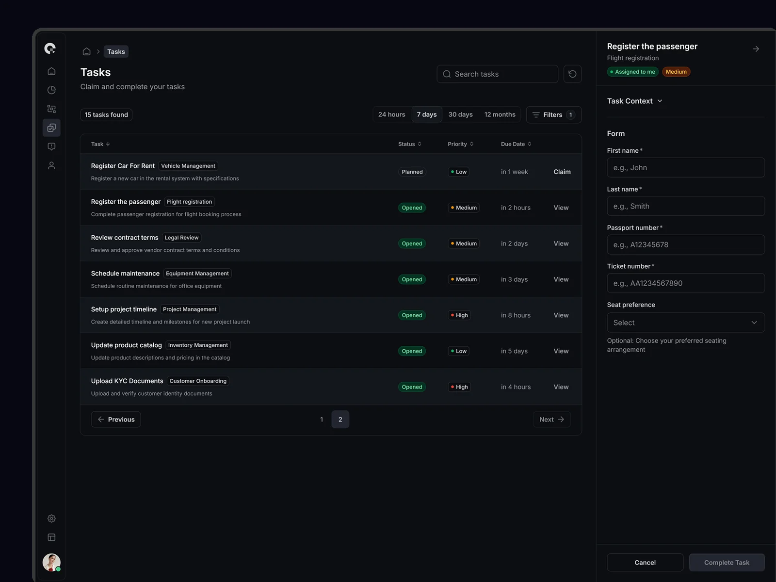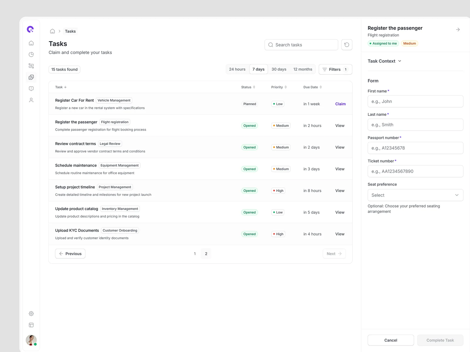 CAMUNDA task interface with contextual information panels and process history.